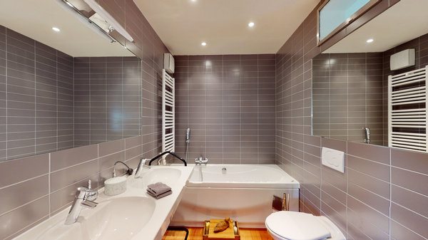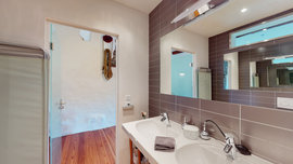 Im ersten Stock befinden sich 2 große Schlafzimmer mit entsprechenden Badezimmern (Dusche) und ein weiterer großer Raum, der derzeit als zweites Wohnzimmer genutzt wird, aber natürlich als drittes Schlafzimmer genutzt werden kann; Ein paar Stufen führen uns zu einer Waschküche und zu einer großen verglasten Veranda mit der Möglichkeit zu schließen.